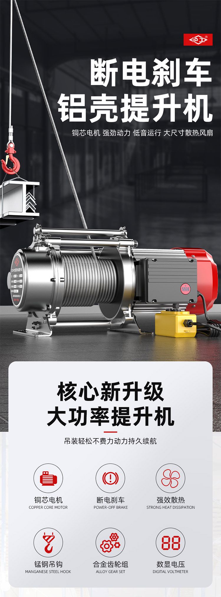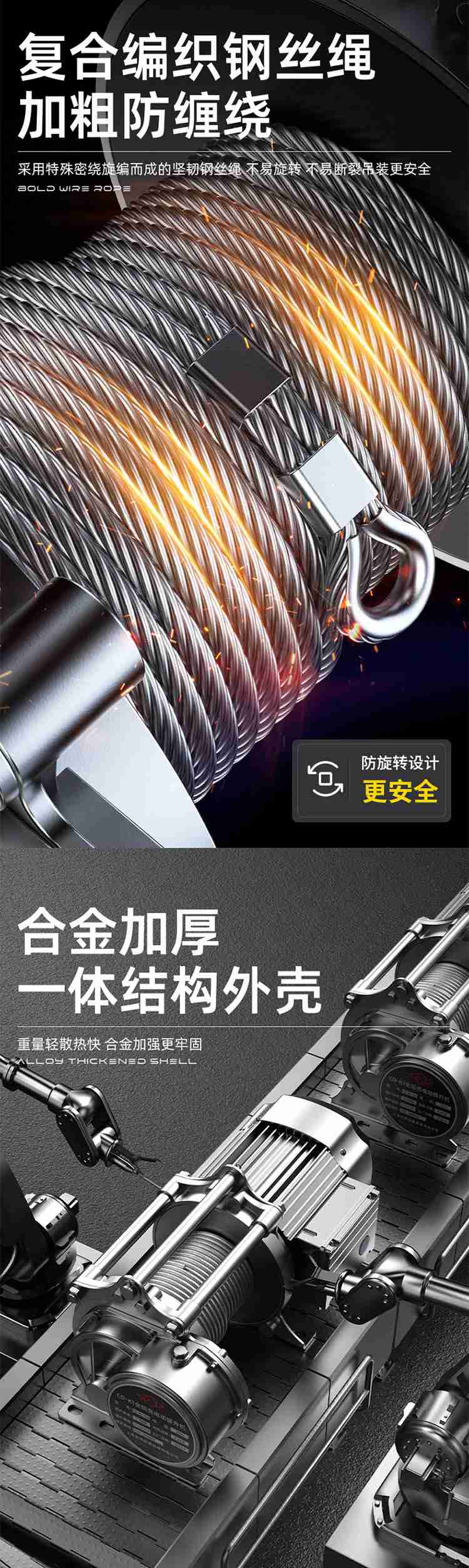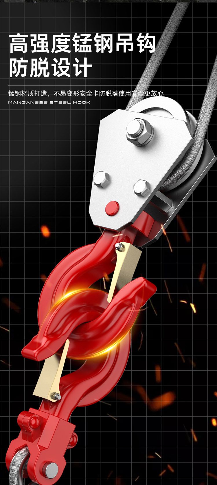 ●鉻鈦合金齒輪組,精密耐磨,復合編織鋼絲繩,加粗防纏繞,不易旋轉,不易斷裂,吊裝更安全。
