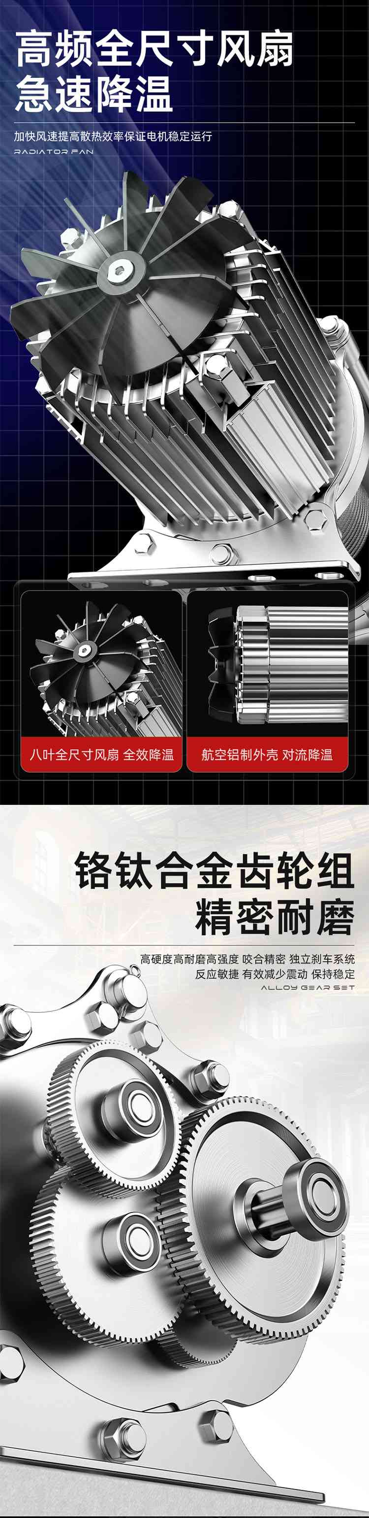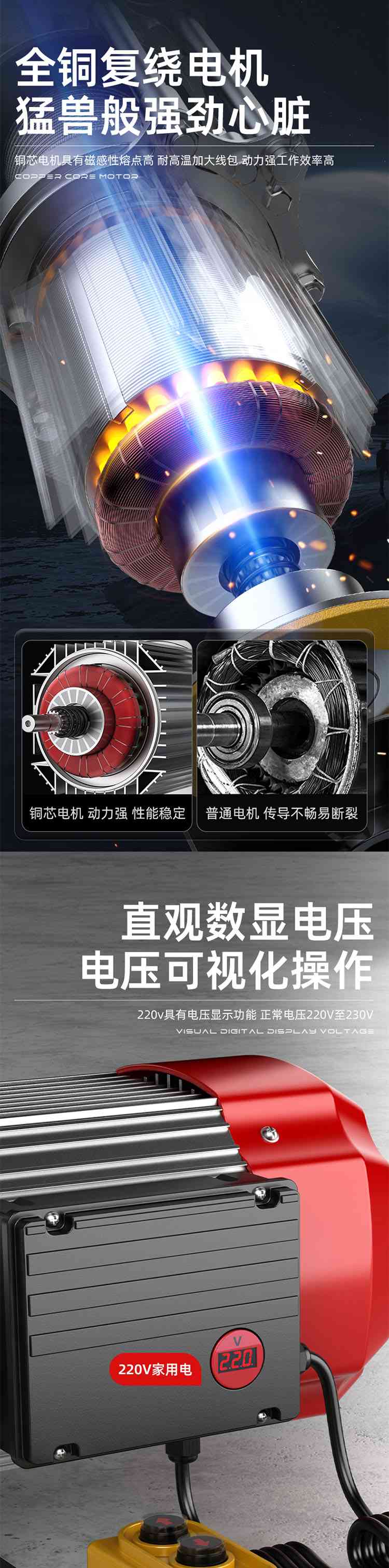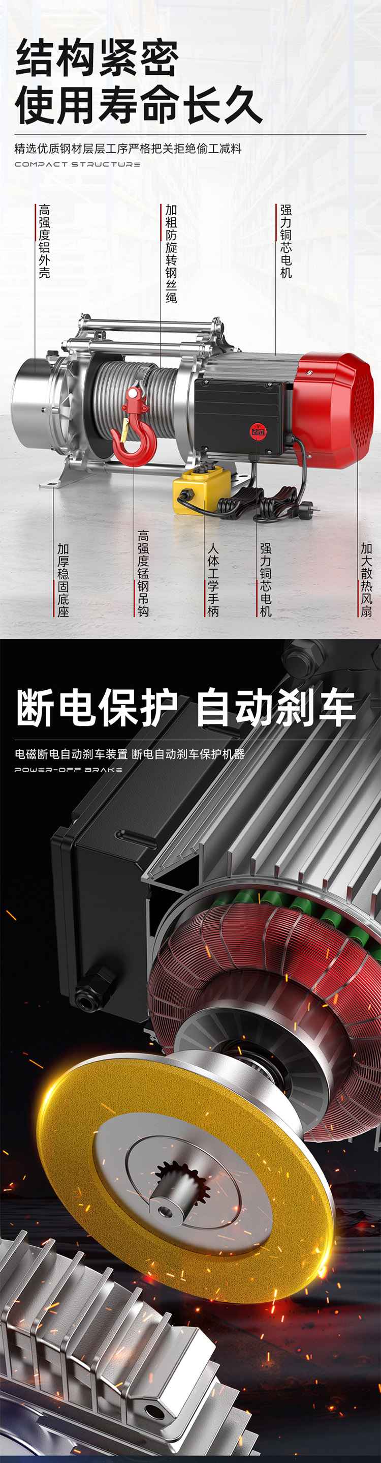 ●鉻鈦合金齒輪組,精密耐磨,復合編織鋼絲繩,加粗防纏繞,不易旋轉,不易斷裂,吊裝更安全。