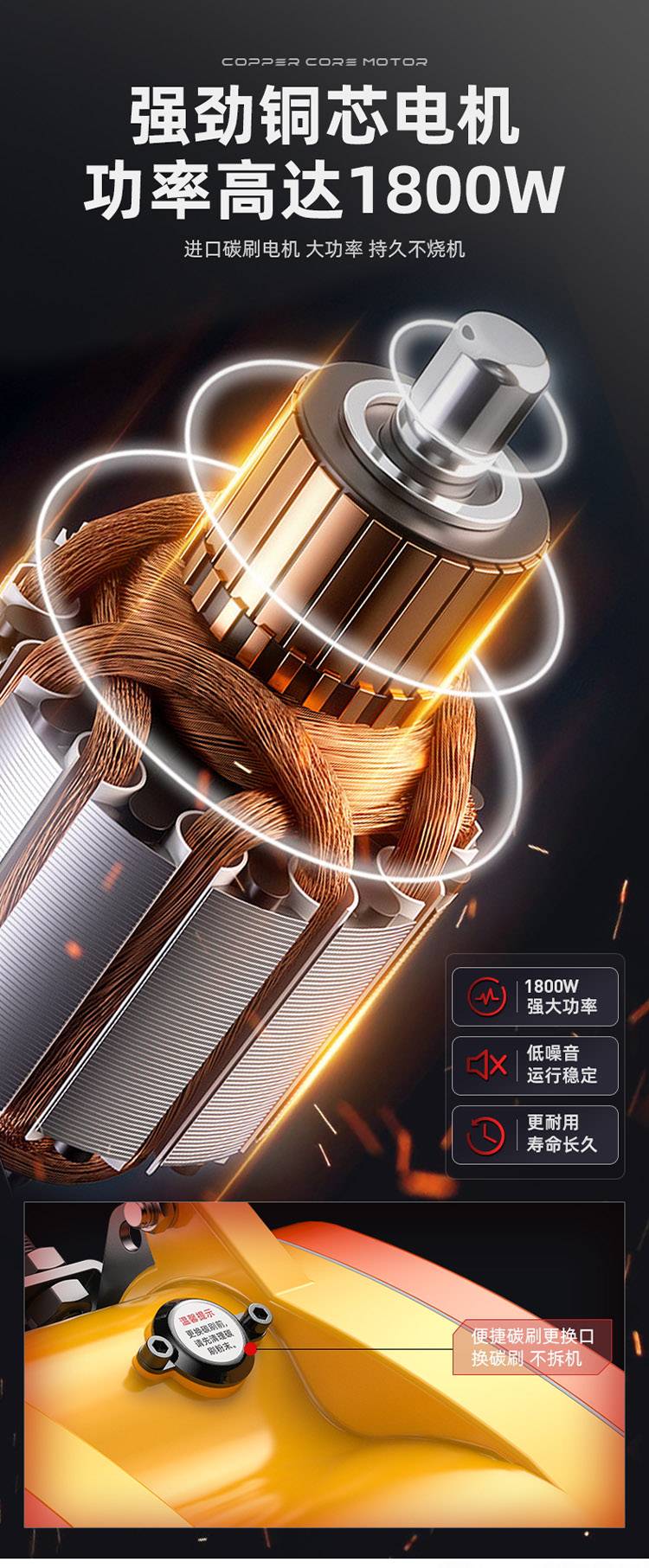 ● 進口碳刷電機,大功率,持久不燒機;