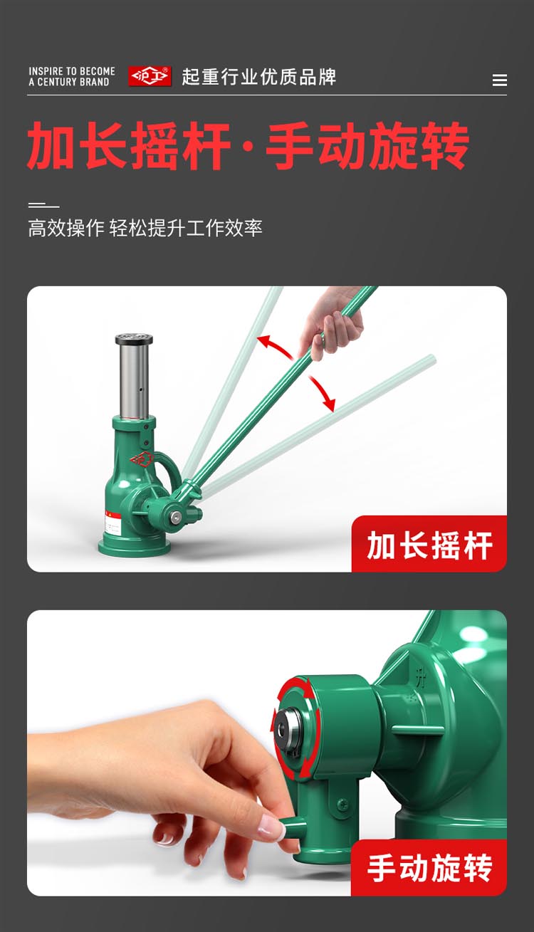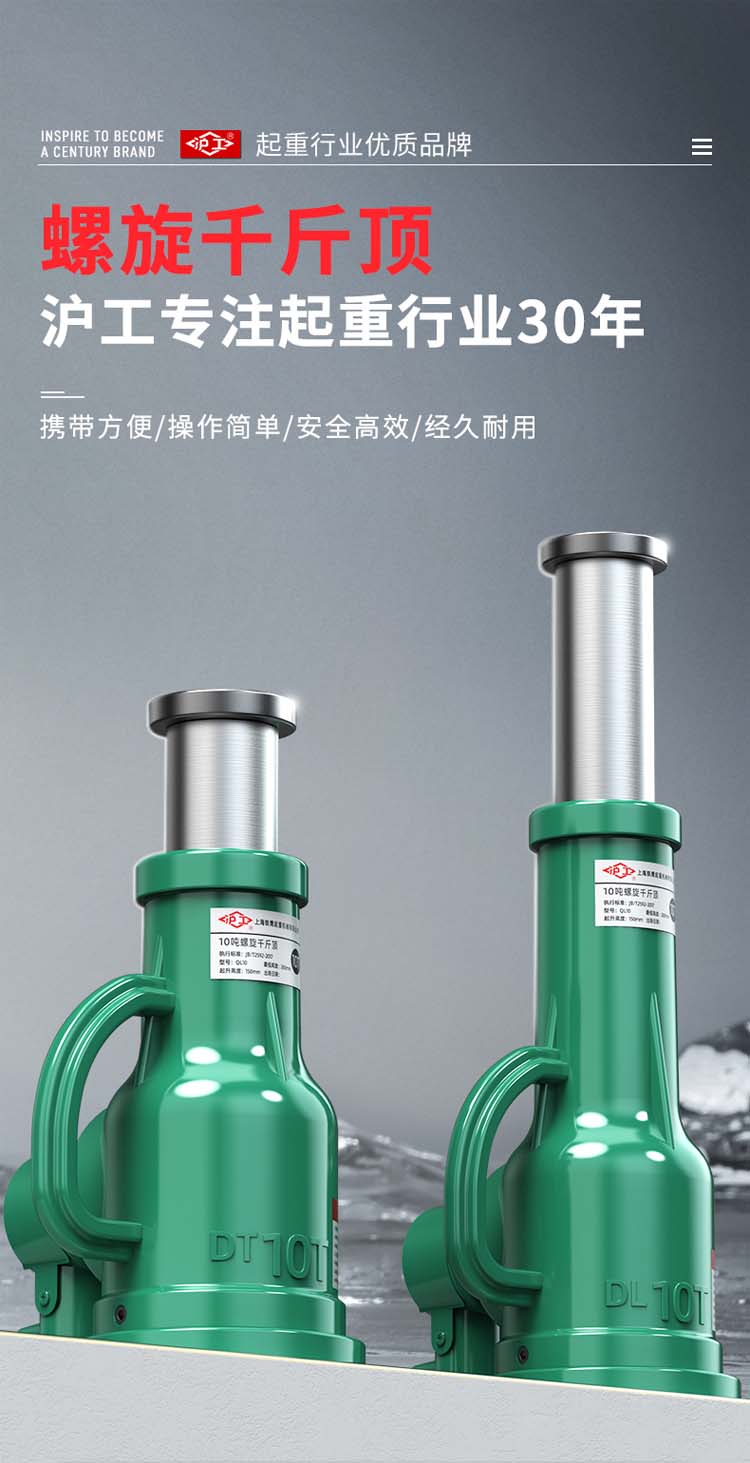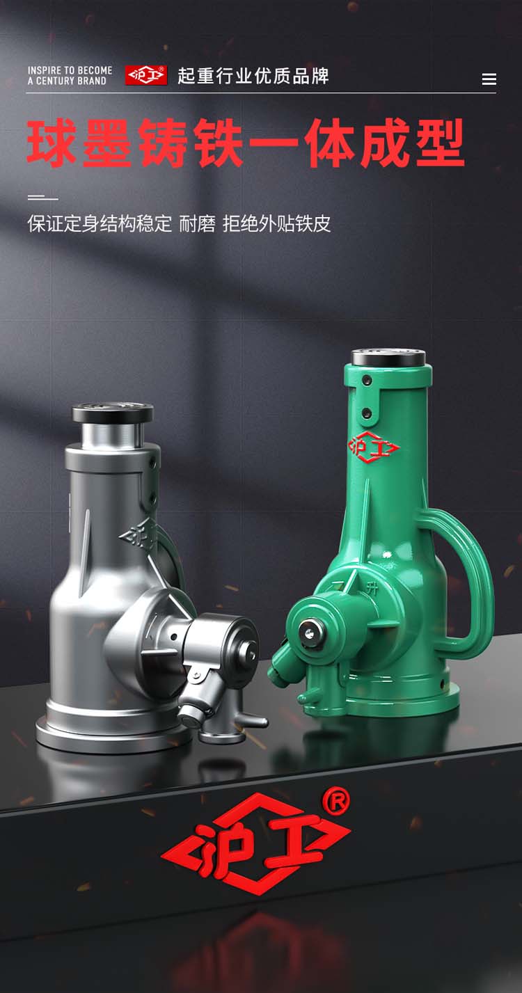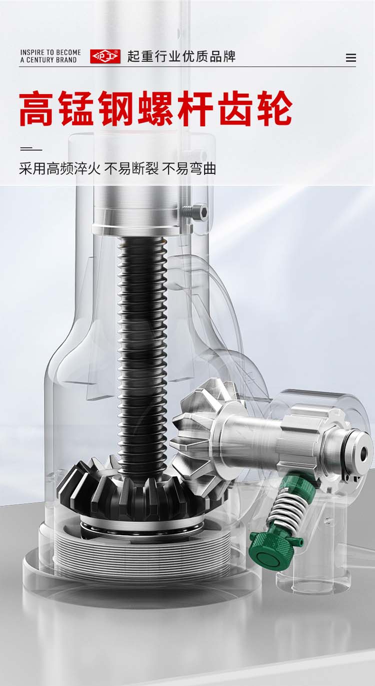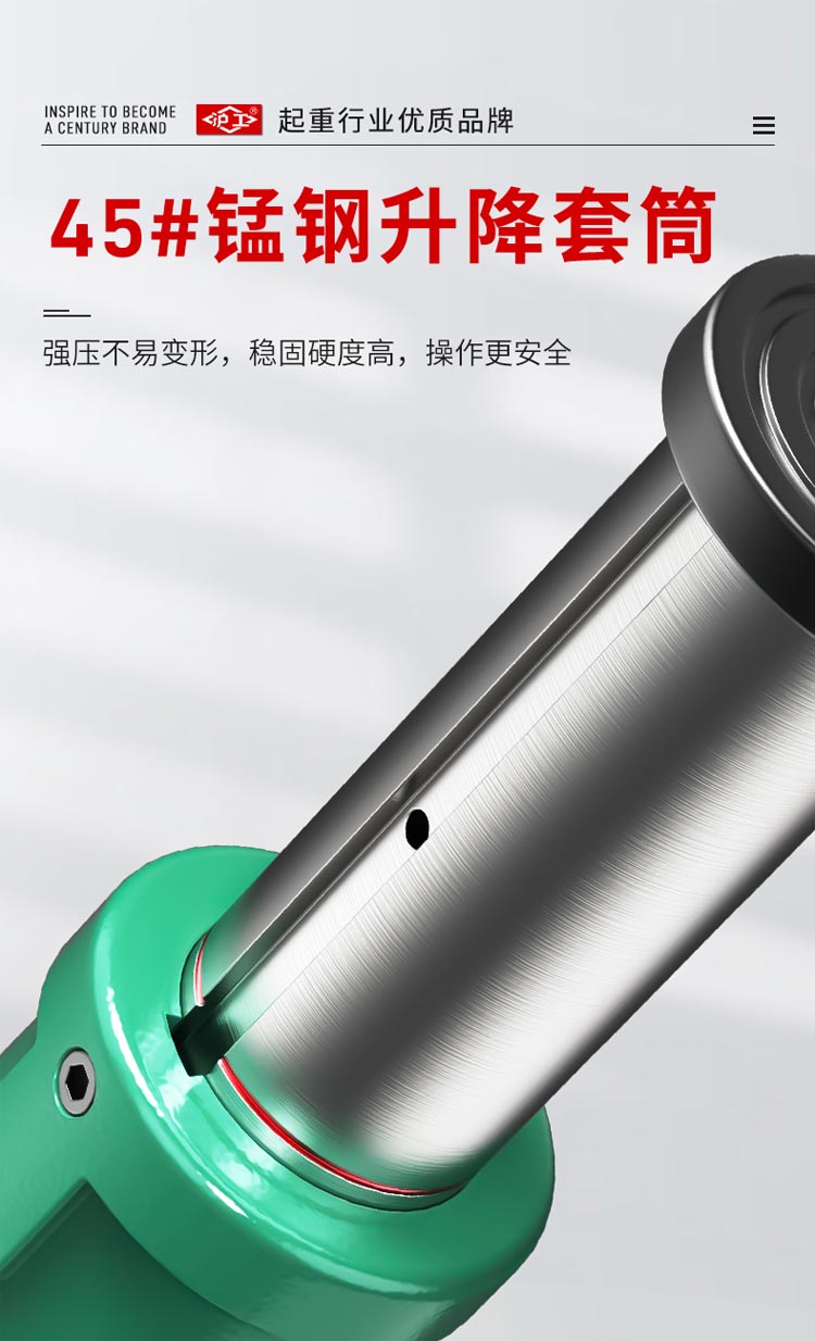 "螺旋千斤頂采用高頻淬火高錳鋼螺桿齒輪,不易斷裂不易彎曲。球墨鑄鐵一體成型,保證定身結構穩定耐磨拒絕外貼鐵皮。45#錳鋼升降套筒,強壓不易變形,穩固硬度高,操作更安全"