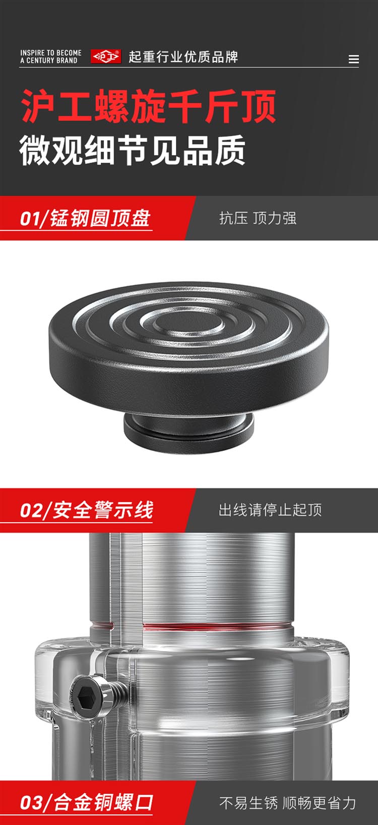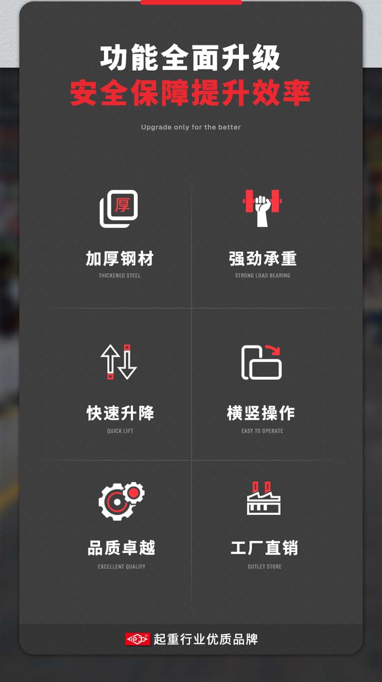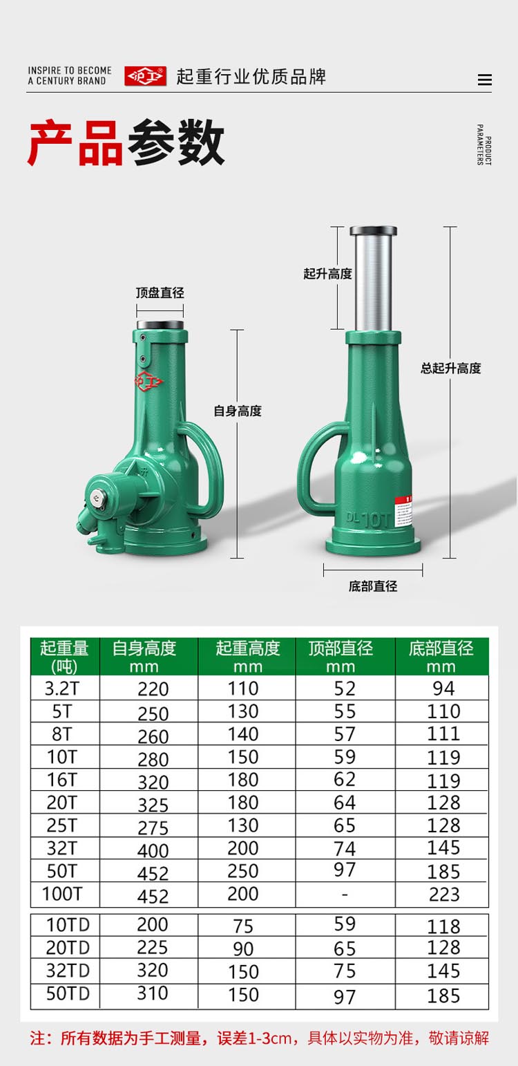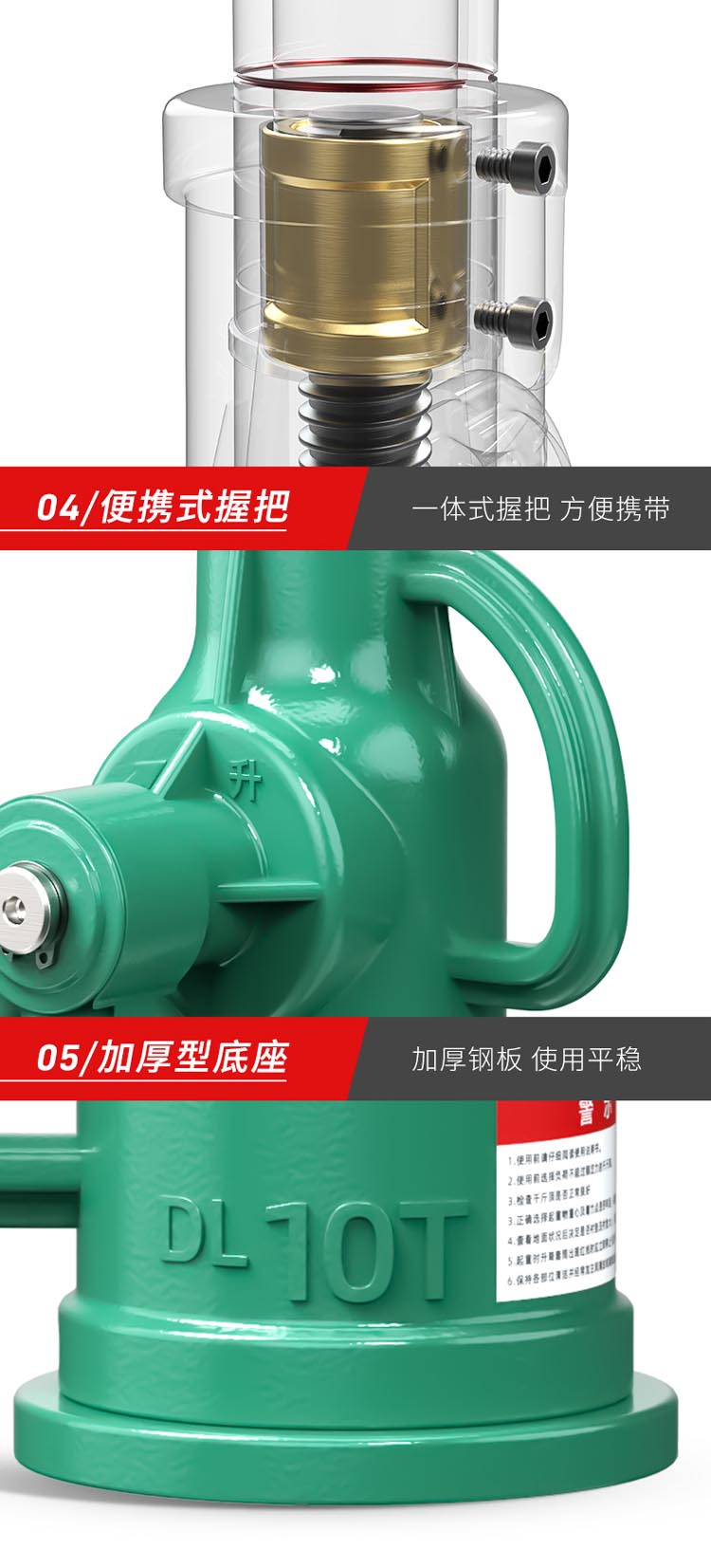 "螺旋千斤頂采用高頻淬火高錳鋼螺桿齒輪,不易斷裂不易彎曲。球墨鑄鐵一體成型,保證定身結構穩定耐磨拒絕外貼鐵皮。45#錳鋼升降套筒,強壓不易變形,穩固硬度高,操作更安全"